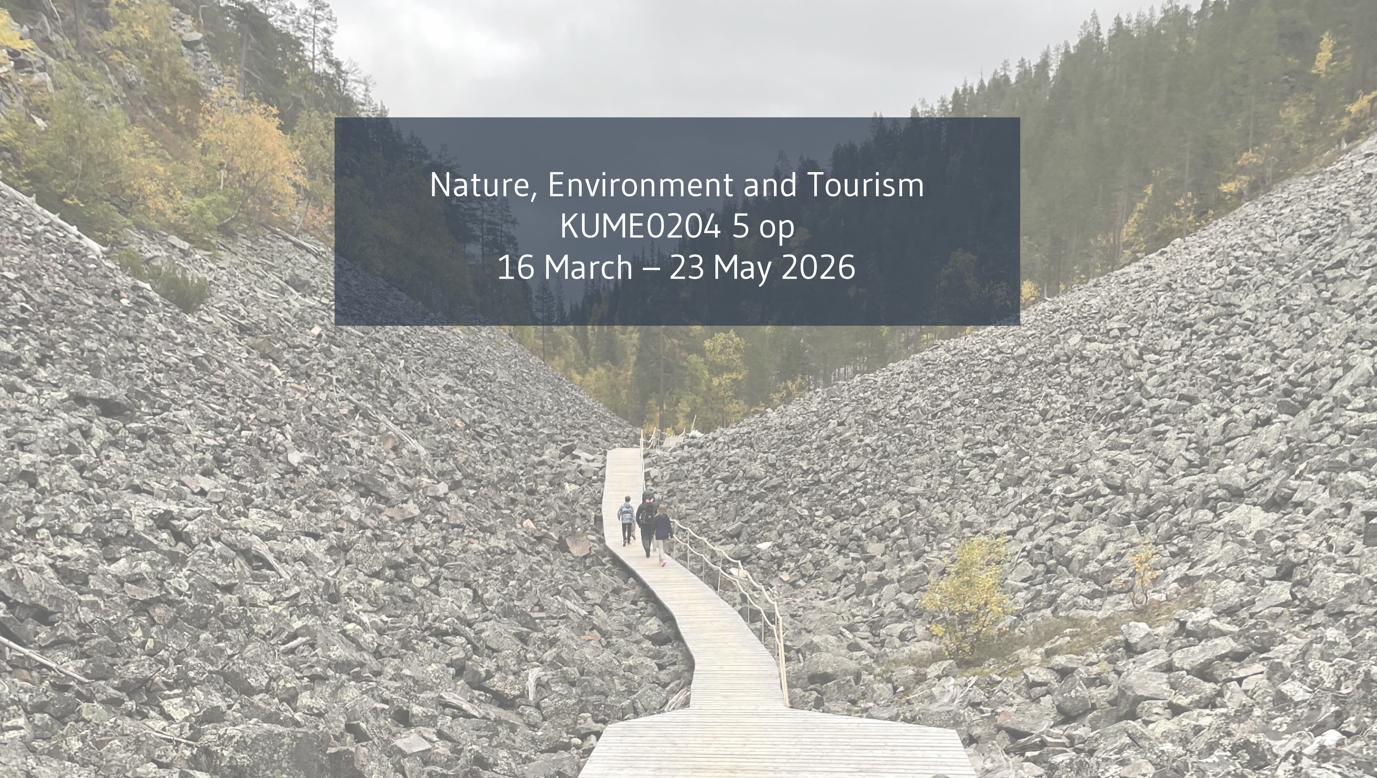 The course introduces past and present trends in tourism and outdoor recreation, particularly in Nordic contexts, and explores how these activities are intertwined with climate change, biodiversity loss, and pollution. It engages with academic discussions that help rethink human–nature relations in tourism settings. Throughout the online course, students are encouraged to test these ideas in their proximate surroundings. The course aims to broaden understandings of the roles of tourism and outdoor recreation in times of ecological crisis.